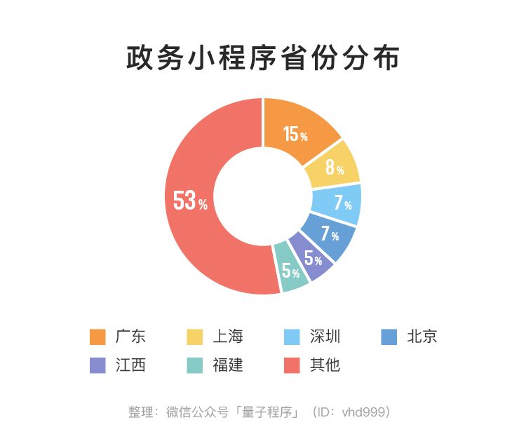 从地理空间上看,腾讯大本营所在的广东对小程序最积极,也是上线政务小程序最多的省份,占全部样本的15%,其它一线城市上海、深圳、北京紧随其后,分别占8%、7%、7%。由此可见,在接纳小程序这一新生事物上,一线城市的姿态最为开放。
