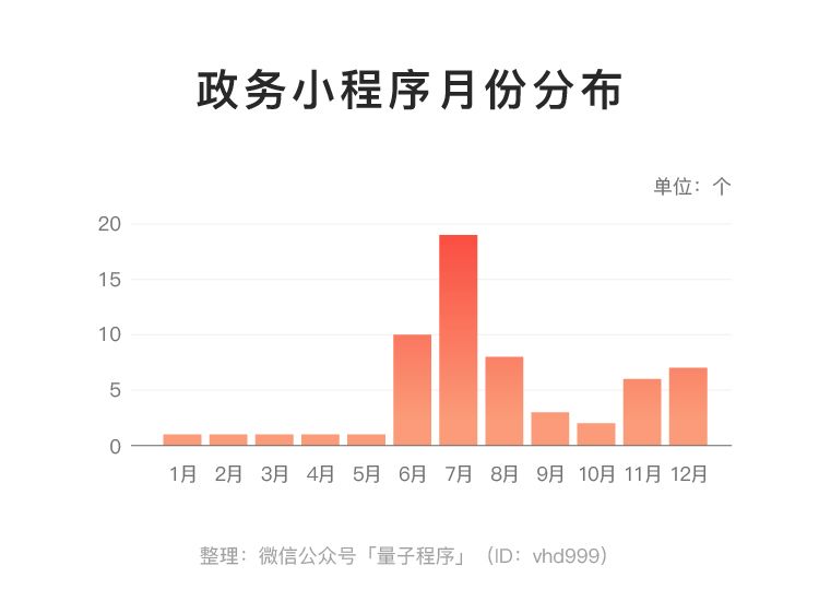 而在时间维度上,在我们统计中,各省份6、7、8月上线的政务小程序最多,其中7月上线了19个政务小程序,为2018年全年最高。