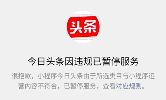 新榜讯 2月1日,有网友向榜妹爆料,小程序「今日头条」因所选类目与小程序运营内容不符合,已暂停服务。目前,微信iOS版与安卓版均已无法搜索到小程序「今日头条」。 小程序推广找新榜!你的小程序是否也面临流量困境?新榜整合腾讯广点通、微信公众号、头部小程序等优质渠道资源,为您提供一站式小程序流量解决方案,助您抢占小程序红利。详情请加微信:xbyxfw02 小程序价值 千万级用户 即速应用 微信挑战者 微信公开课 有车以后 支付宝下拉 黑猫看电影 酷客多 手机进化史 我的小程序 你我您 2018融资 政务小程序 美宜佳