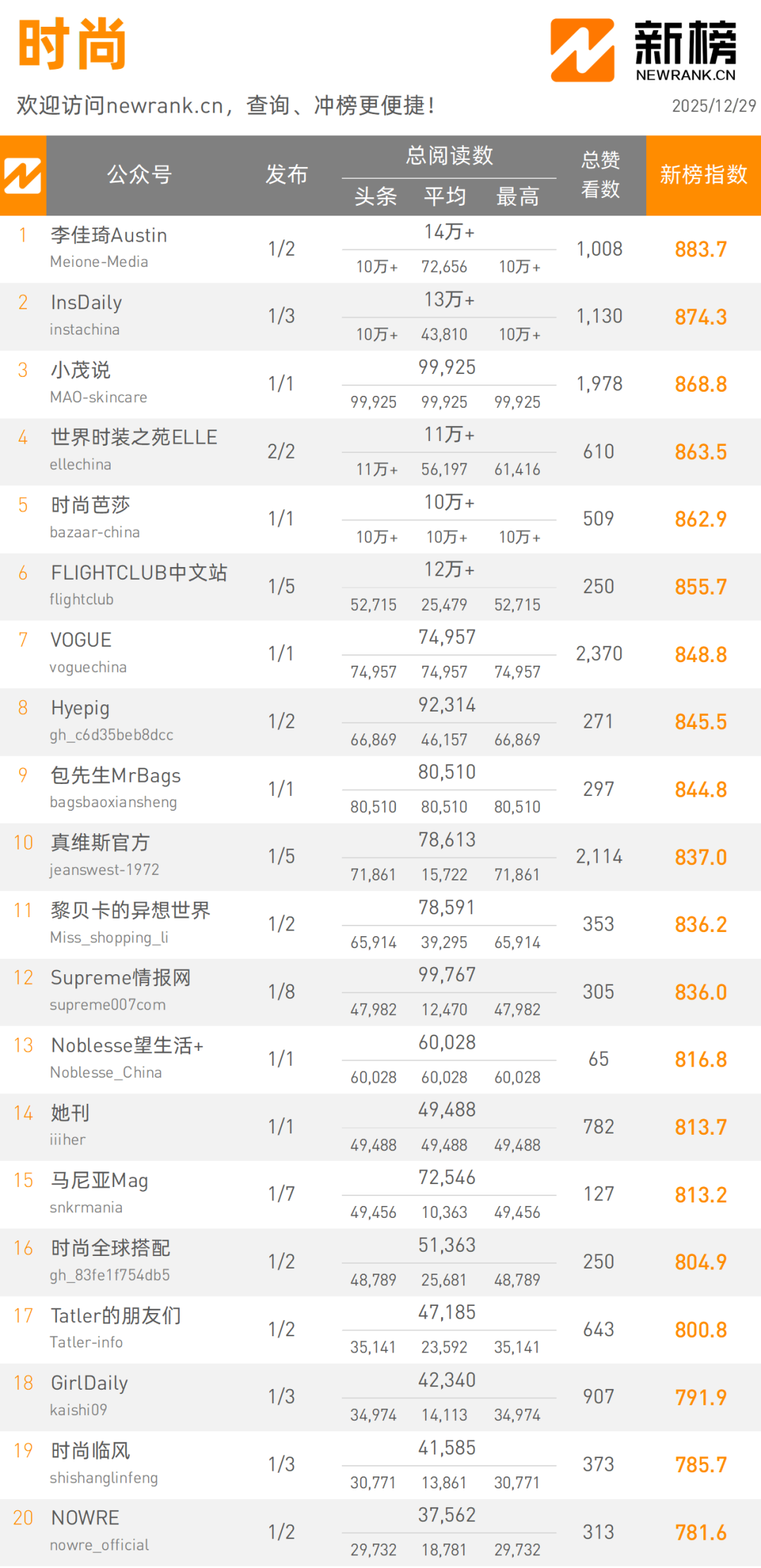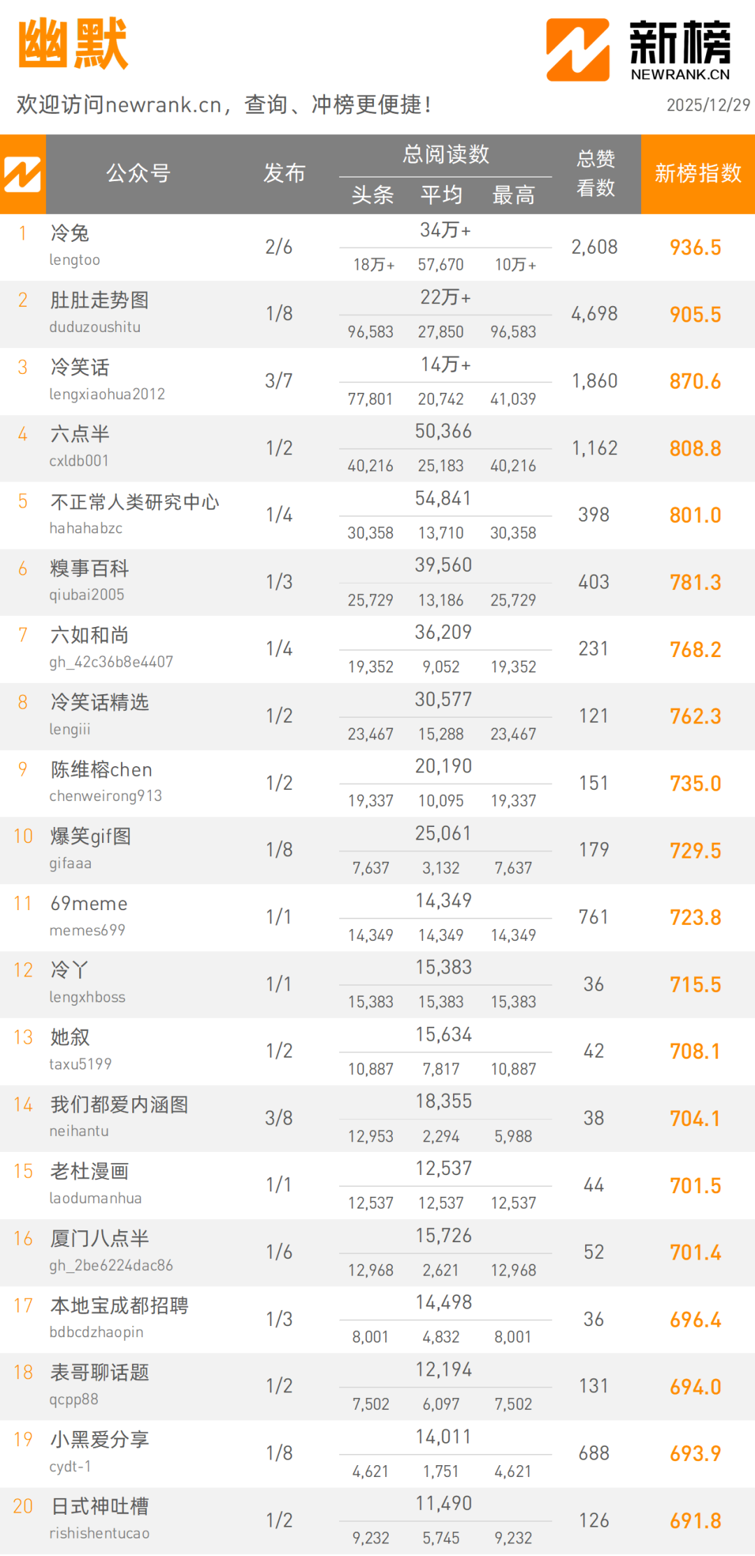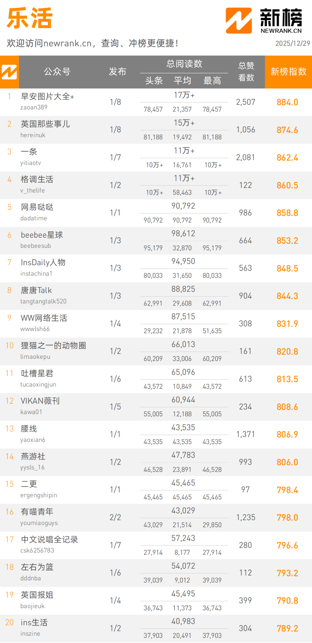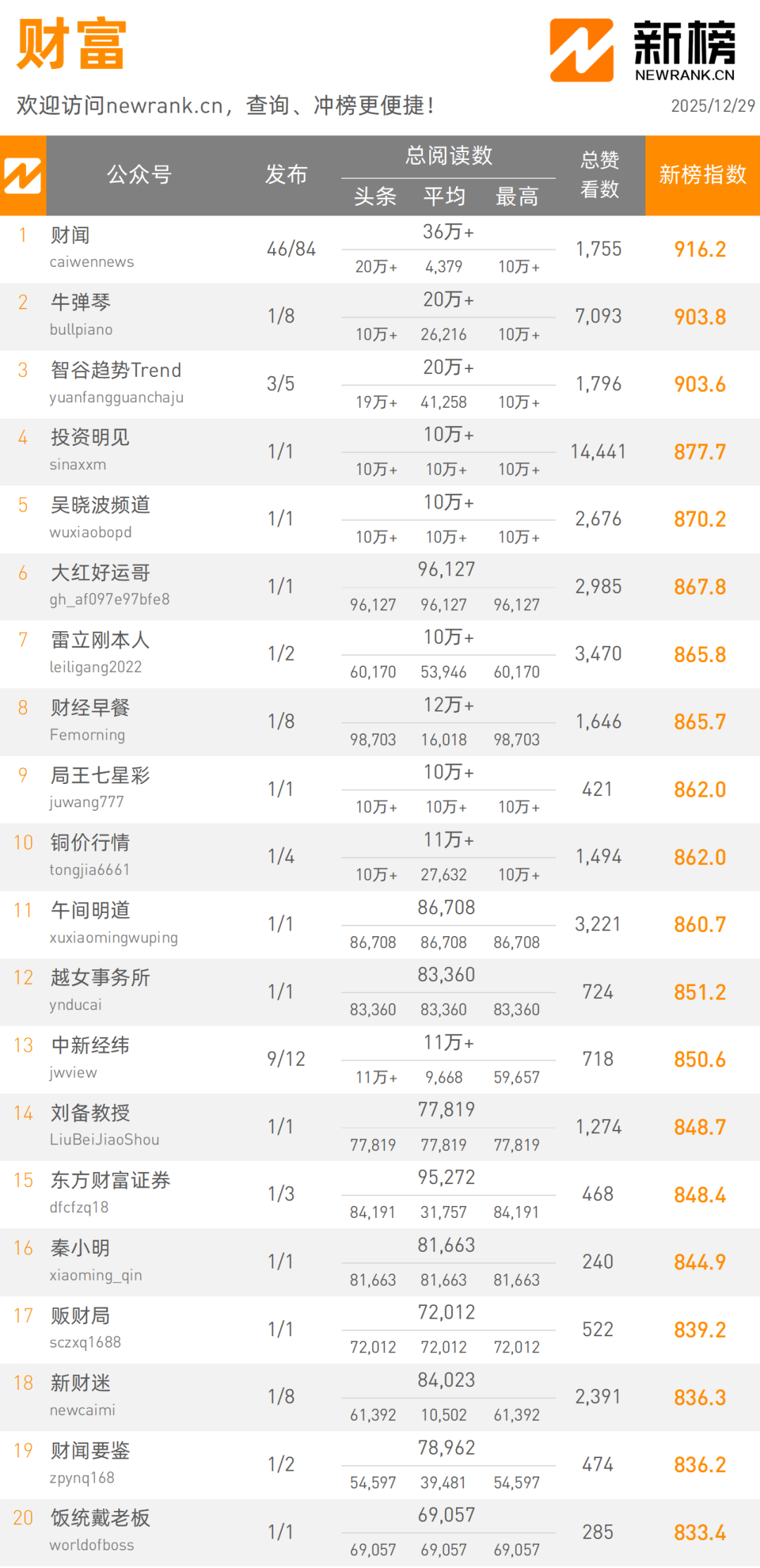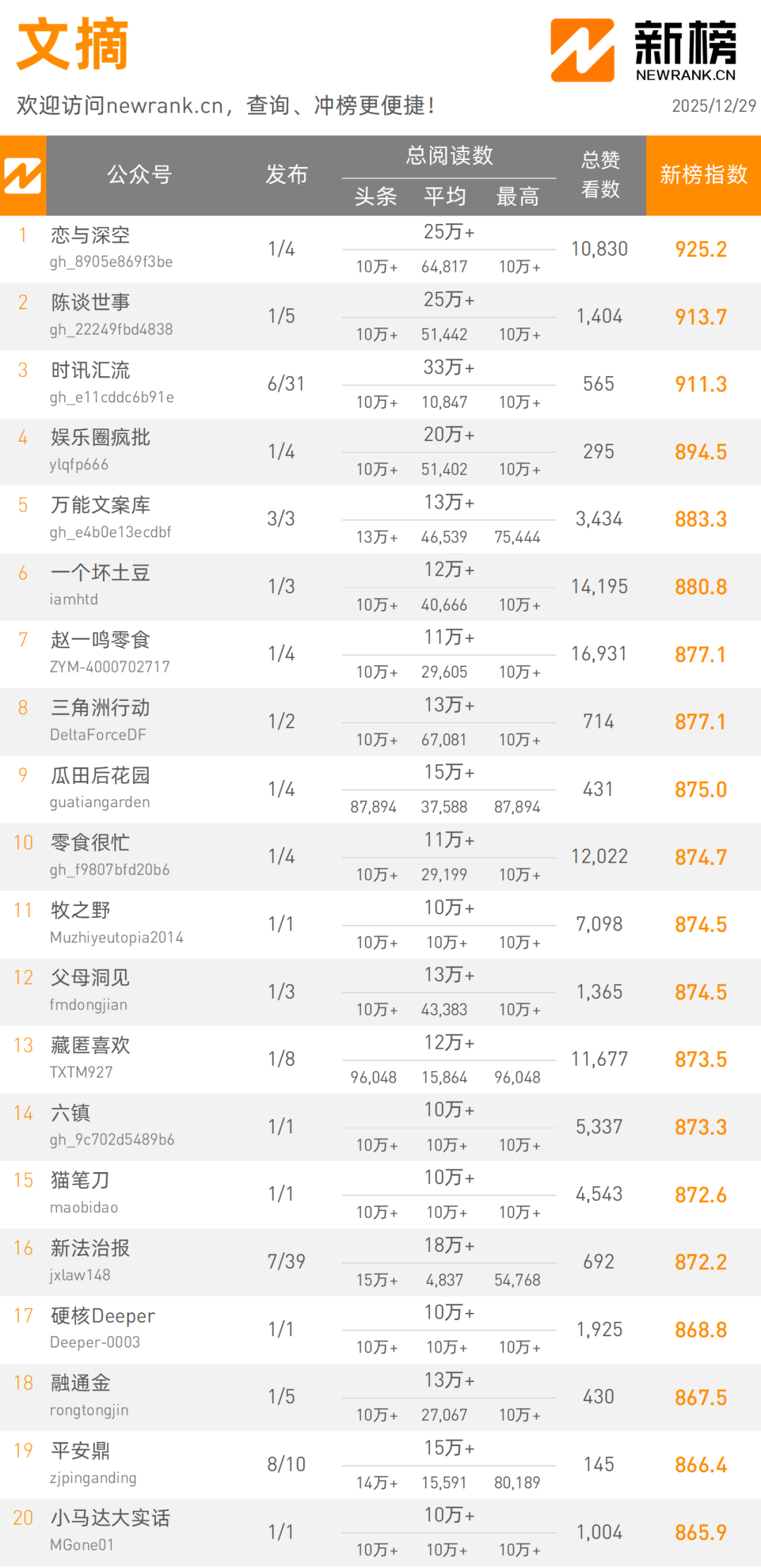 12月29日微信公众号影响力排行榜 | 新榜发布 | 新榜出品