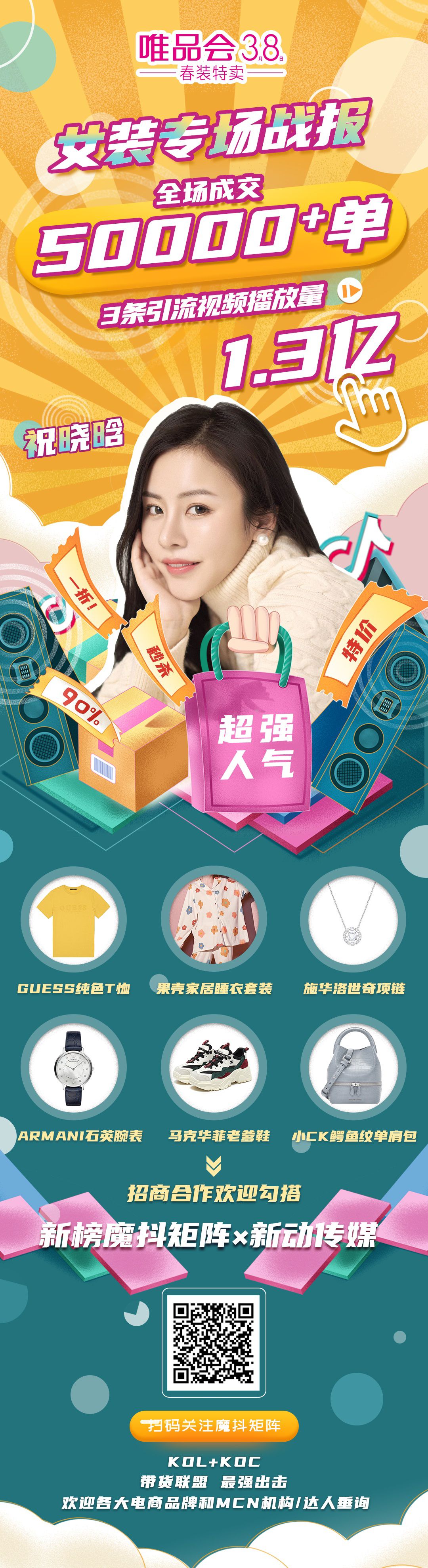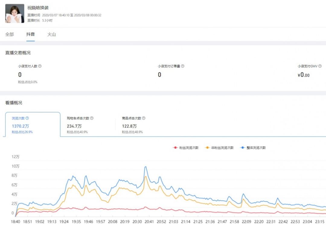 在最近一周抖音官方发布的“直播分享热榜”上,短视频红人“祝晓晗”位列第一。 值得注意的是,这还只是祝晓晗第4次尝试直播电商。 时值疫情期间,又是3.8女神节,抖音大号、淘宝大号齐齐开播,祝晓晗是怎么赶超排在第二、直播了8场的“小小莎老师”,以及周榜冠军专业户“陈三废gg” 的呢? 毕竟半年前,“祝晓晗”等家庭剧情号还被不少同行认为是“没有前途”“没有任何电商属性”的抖音内容号。 今天,我们来回顾下祝晓晗的带货史。 爆单5万单,涨粉42万 祝晓晗的带货史,还要从今年1月8日开始讲起。 当天,祝晓晗的年货节直播活动也是她第二次的电商尝试(第一次在2019年,由于销售数据不佳,据说曾一度放弃), 这次直播单场成交2.2万单,涨粉7.5万。 据祝晓晗招商团队介绍,为达成这场直播,祝晓晗在1月5日发起#晓晗拜年团#等抖音话题进行直播预热,引来大量素人小V跟拍(有些视频1月8日后已隐藏), 最终话题视频总播放量达到1亿次。 1月9日,抖音年货节直播广场战报,祝晓晗一下子冲上了第四名,连每天徘徊在前三的“韩国媳妇大璐璐”、“海头港海鲜”等头部带货号都被挤到了5名开外,打破了剧情类IP无法带货的业界预判。 有了前面的积累,2月23日,祝晓晗受抖音官方邀请,举办了一场名为“我们的抗疫生活”的直播,当时单场直播的在线人数一直保持在9万+,后周榜排第三,相较于其他直播场次比较勤奋的达人,爆发力已初见端倪,据介绍,该次直播单场爆单3.8万单,涨粉12万。 3月7日,也是疫情期间第一个“购物节”。面对线上不少商家生产力未恢复,部分地区物流也无法覆盖的情况,唯品会实行了全国顺丰包邮,24小时内发货,并与祝晓晗合作了一场女装的专场直播。 据了解,当时由于祝晓晗的粉丝画像中有65%都是男性,双方都对直播效果感到“心里没底”,但结果整场直播最终带来1370万次观看,唯品会的商品页面获得了234万次点击,不少观众在留言区发评论“没有码了”“买不到了”。(连当时也在围观直播的榜妹,也只抢到了3个单品……) 据唯品会反馈,该次祝晓晗“唯品会”专场里,卖的最好的是一些高单价的商品,诸如原价1799元,晓晗专享价1000元的ARMANI手表,再比如原价988元,晓晗专享价464元的施华洛世奇项链,据说当时被瞬间秒光,也打破了很多人对抖音电商“仅限于成交低单价商品”的认知。 最终,这场直播单场爆单5万单,为祝晓晗带来42万涨粉。 对于一个全程女装换装的直播现场来说,65%男粉的祝晓晗是如何做到直播间维持在10万人在线热度的?(由于抖音的算法比较实诚,在抖音没有官方活动的情况下,很少有直播间能做到直播间10万人在线) 我们观察到,在3月7日当天祝晓晗一共发布了3条引流视频。据祝晓晗方面提供的播放量截图,这3条引流视频的总播放过亿。这些高播放量和传播度的视频,本身也给直播间的高人气奠定了基础。 再回过头看祝晓晗的3次直播带货,涉及的品类范围很广,远没有局限在祝晓晗作为短视频达人自身的标签: 第一场年货节,90%为食品;第二场“抗疫生活”,30%为食品,40%为日用品,30%为美妆个护产品;第三场“唯品会”女装专场。 既然粉丝标签并不是限定带货品类的因素,那么究竟应该如何选品?祝晓晗方面认为,靠每次直播来调整直播选品的方法是比较科学的,“通过每次直播开拓新的品类和价格带,然后通过复盘不断优化,才能一次比一次更好”。 直播电商看似简单,在购物车里挂个商品就能卖,门槛低,但其实入门容易,进阶很难。 低成本曝光 抖音已成为新品牌必争之地 对于还在观望的商家来说,抖音电商除了能对接淘宝的产品,还能对接入驻京东的商家、入驻唯品会的商品等,结合抖音最新公布的DAU,抖音电商已经是获得淘外高曝光的最佳平台。 尤其像祝晓晗这样的直播间,虽然有超高的曝光度,也会引发超高的商品点击和浏览加购(熟悉淘宝运营的商家就知道来自淘外引流的这两个指标对店铺有多高的重要性),但真实的销售转化与淘内直播相比并不高。 所以祝晓晗团队推出的纯CPS(0坑位费)的招商模式对商家来说简直是业界最高性价比的曝光利器了。 仅需付出实际的销售佣金,即可获取免费的大流量曝光和产品的加购收藏,比如个护类目在淘内的千次曝光成本大约在5-8元之间,直播间的千万级别的曝光就价值5-8万了,更不用说引导的收藏加购及销量,而商家所需支付的仅仅是销售佣金。 祝晓晗的招商团队一直笑称“选上就是赚到”,此言不虚。 再来看下参加本次祝晓晗抖音直播的某糕点品牌,当天在淘宝内的展现指数飙升到30天的最高值,然而在12月17日,该品牌在淘内第一大直播间上播,上播后第二天该品牌在全网的自然展现跌到谷底。 与淘宝直播粉丝跟着主播走的羊毛党不同,抖音引流进店铺的粉丝,复购也会落在店铺,所以越来越多的店铺开始意识到抖音引流的高性价比及重要性。 真正懂淘内运营的同学一看就懂这里蕴含的价值。淘内的公域流量越来越贵,千人千面令流量愈加碎片化, 如果按照全域ROI来盘,抖音引流到淘宝后再结合传统的直钻工具,做好老客复购,全面做好店铺承接,抖音的引流真是绝对的红利期。 目前,抖音已成为品牌打响知名度、推新的必争之地,更是国货品牌首选的种草、卖货、加强品牌公信力的主战场。 我们认为,今后会看到越来越多的国货品牌霸占各个品类的TOP榜。 舞王刘能也来直播