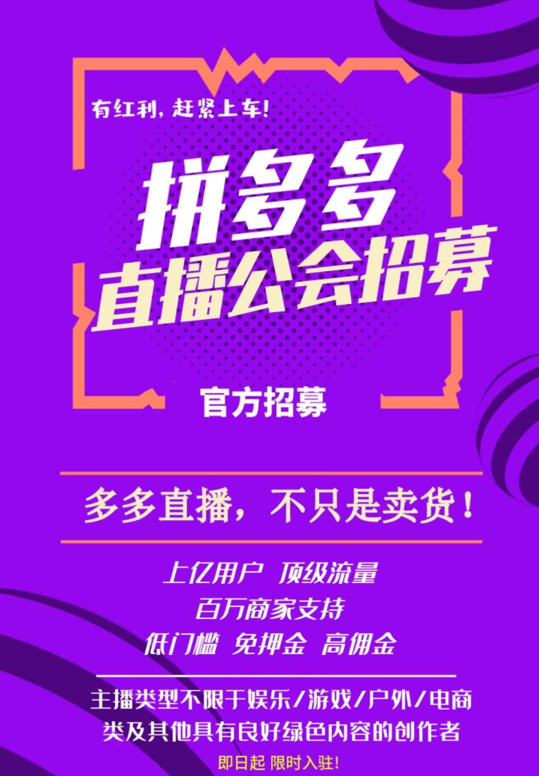 据今日网红 4月23日,拼多多对外招募秀场直播公会,主播不限娱乐、游戏、户外等类型。目前拼多多已与多家MCN就生产娱乐内容达成合作。 据了解,多多直播具体的秀场直播政策有2大关键点: 1. 主播固定分成50%,收入达到一定金额后,可以随时提现。 2. 公会按阶梯任务制划分,分成在20%~35%之间。 更多资讯,敬请关注公众号「新榜」(ID:newrankcn)。