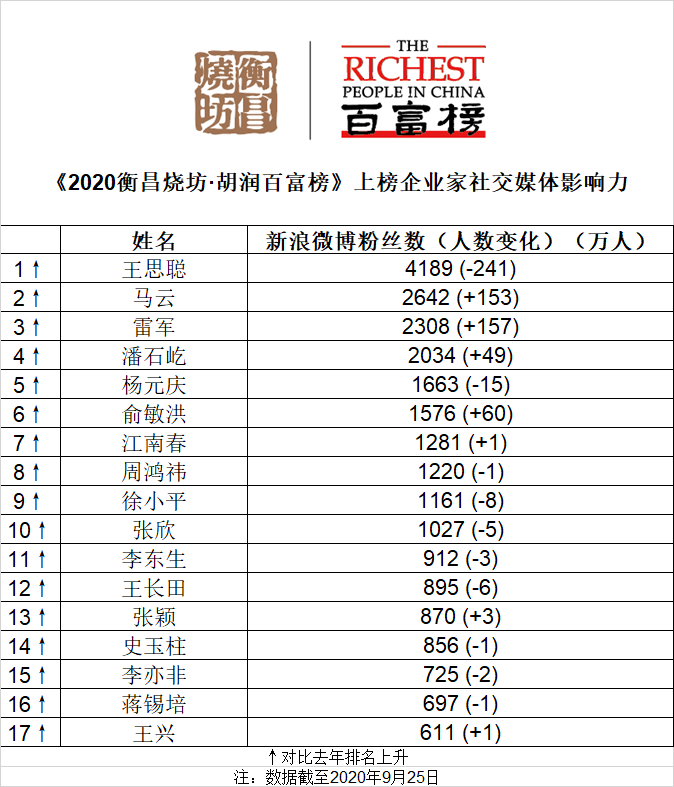 据36氪 10月20日,《2020胡润百富榜》发布,前任微博最红的上榜企业家赵薇和她的先生黄有龙近年来财富严重缩水,今年跌出榜单,所以今年微博最红的上榜企业家是王思聪,虽然他的微博粉丝数较去年有所减少。