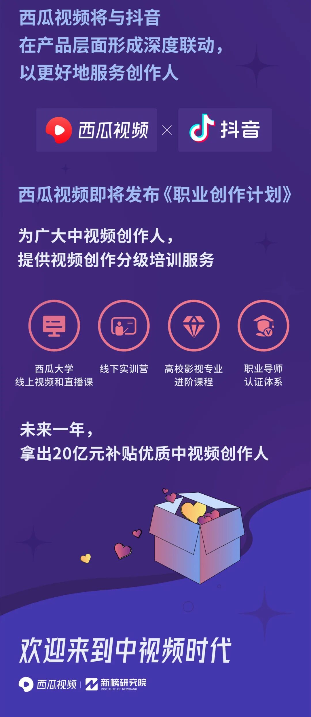 今天的2020西瓜PLAY好奇心大会上,西瓜视频总裁任利锋宣布未来一年将大力扶持优质中视频创作者,拿出20亿作为补贴。