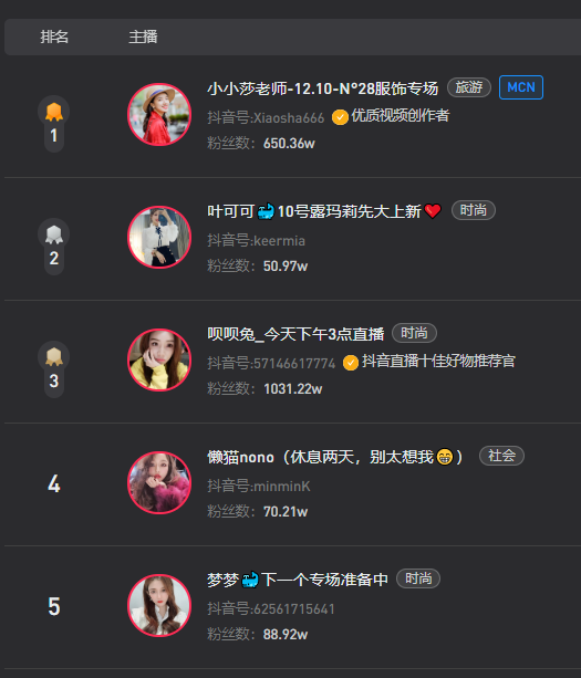 据新榜旗下抖音全场景AI数据平台新抖数据 的主播带货排行统计,包括“小小莎老师”、“叶可可”、“呗呗兔_”、“懒猫nono”等主播位居12月10日带货榜前列。