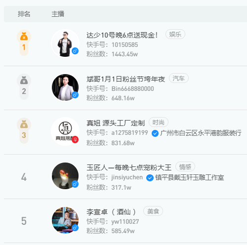 据新榜旗下快手直播电商数据平台新快数据 的主播带货排行统计,包括“达少”、“斌哥”、“真姐 源头工厂定制”、“玉匠人”等主播位居12月10日带货榜前列。