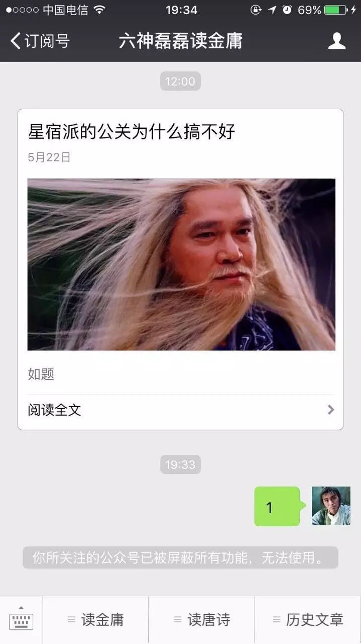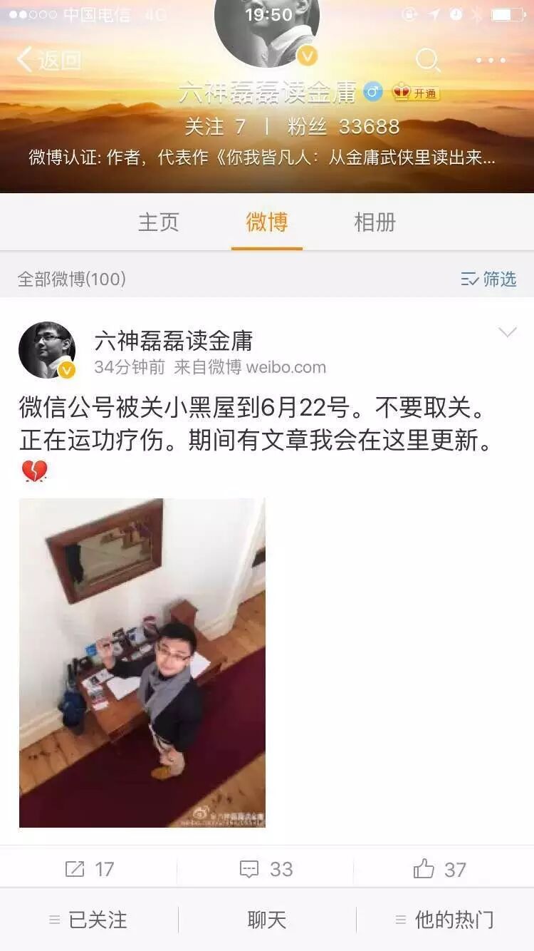 新榜讯 5月22日下午七点,新榜获悉,前新华社记者王晓磊创办的微信公众号“六神磊磊读金庸”确认被封号一个月,原因疑与今日下午发布的《星宿派的公关为什么搞不好》有关。有意思的是,《星宿派的公关为什么搞不好》一文,阅读数已过十万,且至今仍可查看,并未被举报删除。