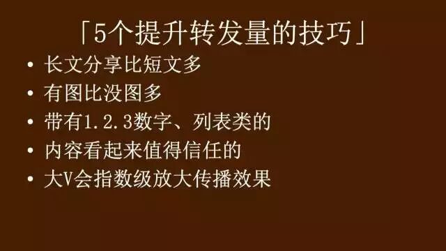 现在来看的话,我们有很多技巧,你写一篇转发类文章的话,你都需要这样的技巧,比如长文比短文分享更多、有图比没图分享更多、带有1.2.3数字、列表类的、看起来值得信任的内容,大V会指数级放大传播效果,但如果你真的去看阅读排行榜或者内容时,会发现有些符合,有些不符合。