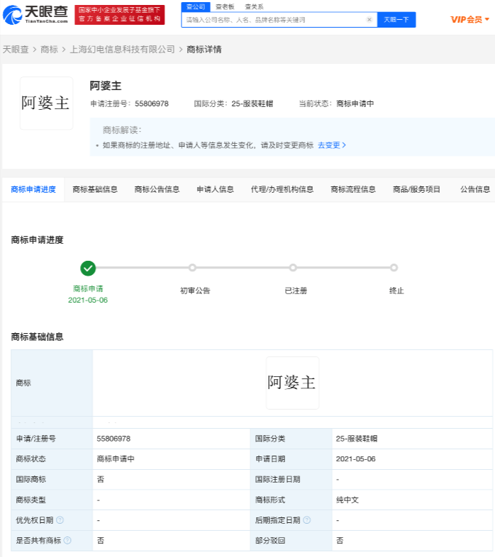 近日,B站关联公司上海幻电信息科技有限公司申请注册“阿婆主”商标,国际分类为服装鞋帽,目前商标状态为“商标申请中”。