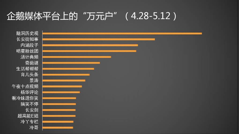 这些是这两周收入破万的账号,通过研究他们写的是什么样的题材,属于什么样的领域,来找寻他们成功的蛛丝马迹。“脑洞历史观”不仅在企鹅媒体平台,在别的地方也很牛;接下来是“长安街知事”,这说明传统媒体拥抱新媒体后也会获得新生;“内涵段子”是搞笑类,大家可以看看他们写的什么内容更受用户欢迎,从而获得更高的收入。这里万元户是原创补贴和流量分成合并。腾讯新闻客户端和天天快报的差异在于腾讯新闻客户端在原创方面补贴更多,天天快报在广告投入上补贴更多。