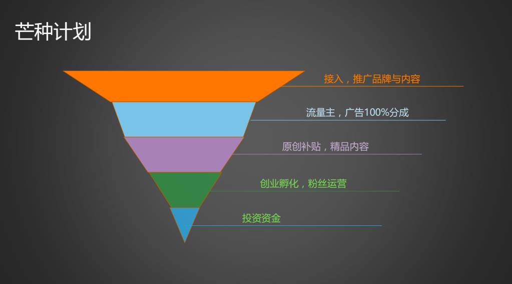 这个金字塔还有塔尖,接下来这两部分,一个是商业孵化,大家都知道腾讯在全国各地搞了很多众创空间,我们会和众创空间一起合作,也会对一些内容创业团队进行场地、资金、融资这方面的支持;第二是直接投资,我们单独有一大笔钱在这里等着大家,这部分现在还没有披露,我只能说不是一个小数字。