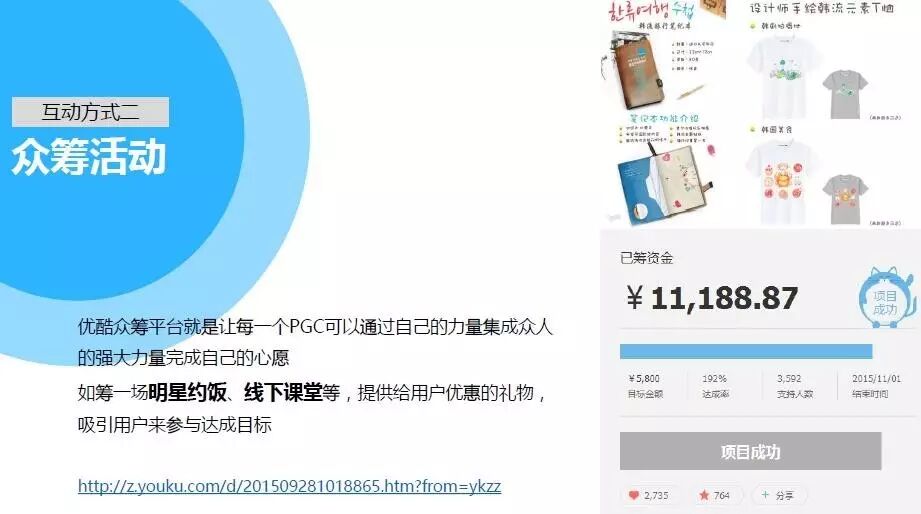 第二种互动方式是众筹活动,比如众筹一场明星约饭、线下课堂等等。自媒体可以利用自己的优势,来为自己的内容加油鼓劲。