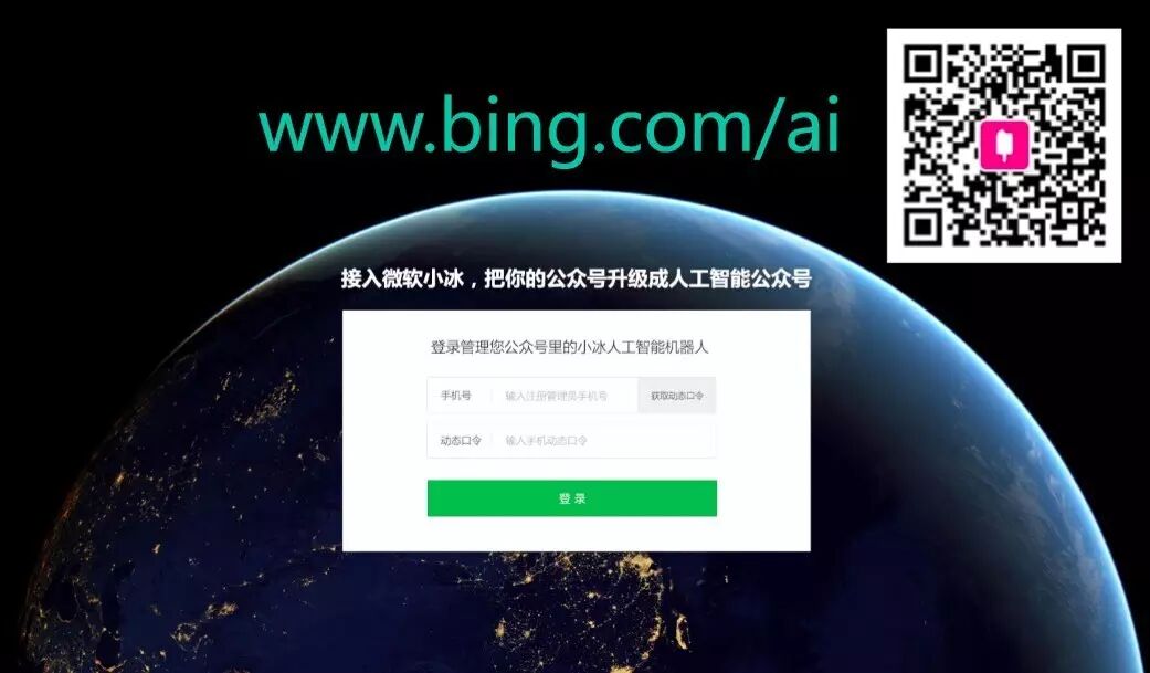 所有关于“小冰”的服务,大家都可以到这个网站实现:www.bing.com/ad,右边是我们整个运营平台的公众号,这个公众号我们每周都有新产品、新技能发布。在这个平台上面大家可以免费的,为自己的微信公众号和微博,接入人工智能的服务。