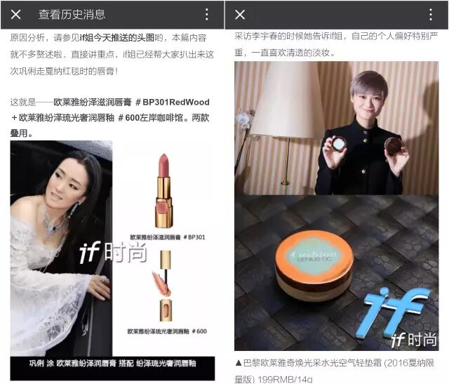 比如,他们在这次戛纳期间推出的巴黎欧莱雅巩俐同款唇膏系列试色报告、刘亦菲同款Dior唇膏系列评测、李宇春同款眼线笔/cc霜系列测评等,都是在尝试告诉用户“非明星的我,用什么东西才适合”的购买指南。