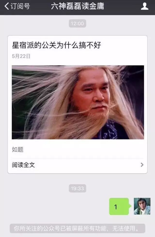 5月22日晚7点,新榜获悉,前新华社记者王晓磊创办的微信公众号“六神磊磊读金庸”确认被封号一个月,原因疑与当天下午发布的《星宿派的公关为什么搞不好》有关,账号被处理后不久,该文也显示“因违规无法查看”。