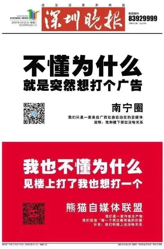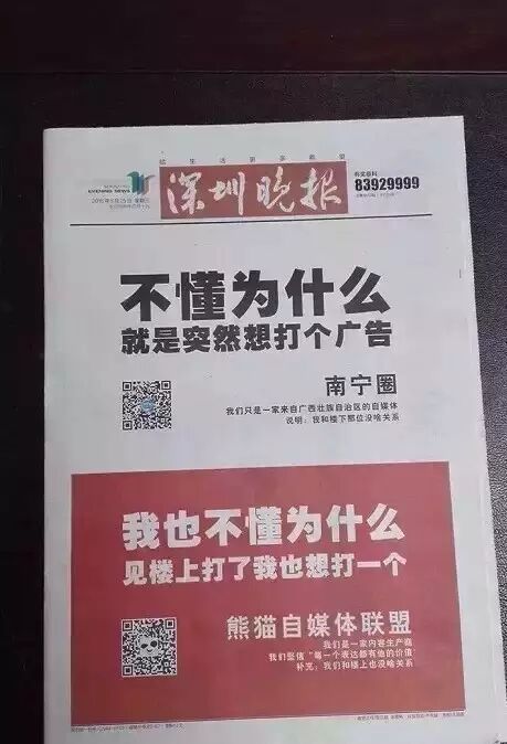 新榜讯 5月24日晚,朋友圈被同一张图片刷屏,从图片上可以看到,地域类大号“南宁圈”和熊猫自媒体联盟联合承包了5月25日《深圳晚报》的头版。广告语也很无厘头。