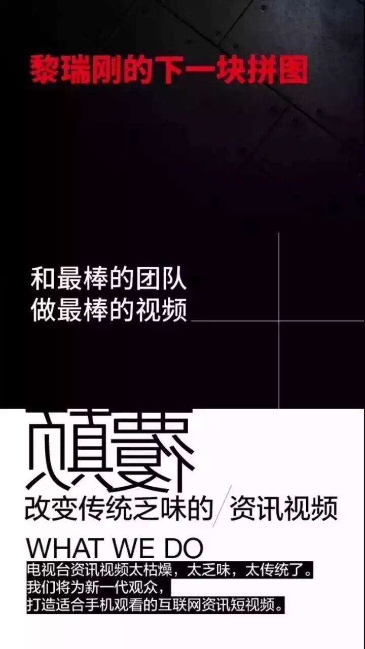 号称“和最棒的团队做最棒的视频”,昨天,一条“黎瑞刚的下一块拼图”视频团队招聘信息在网络传开,据悉这个大量招兵买马的团队正是邱兵领导的视频创业团队: