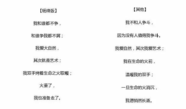 都说字若其人,《杨绛先生的墨迹》中,刊出了杨绛先生的手稿、书法、题词;《杨绛仙逝,再论长寿何如?》中讲到她如何养生;《老先生们的书房》一文,带读者逛了逛杨绛、冰心、老舍、沈从文、丰子恺等老先生们的书房;《杨绛走了…没有了翻译大师们的世界将变得多么无趣和混乱》则从译者的角度,讲到优秀翻译之美和混乱翻译之祸,其中有两段对英国诗人兰德《生与死》翻译的对比。