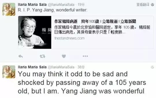 文中还提到,长期关注东亚的《卫报》专栏作家Ilaria Maria Sala连发两条推特致敬杨绛:“如果为一个105岁去世的老人还感到悲伤和震惊,你或许会觉得奇怪,但我不会,杨绛非常伟大。”