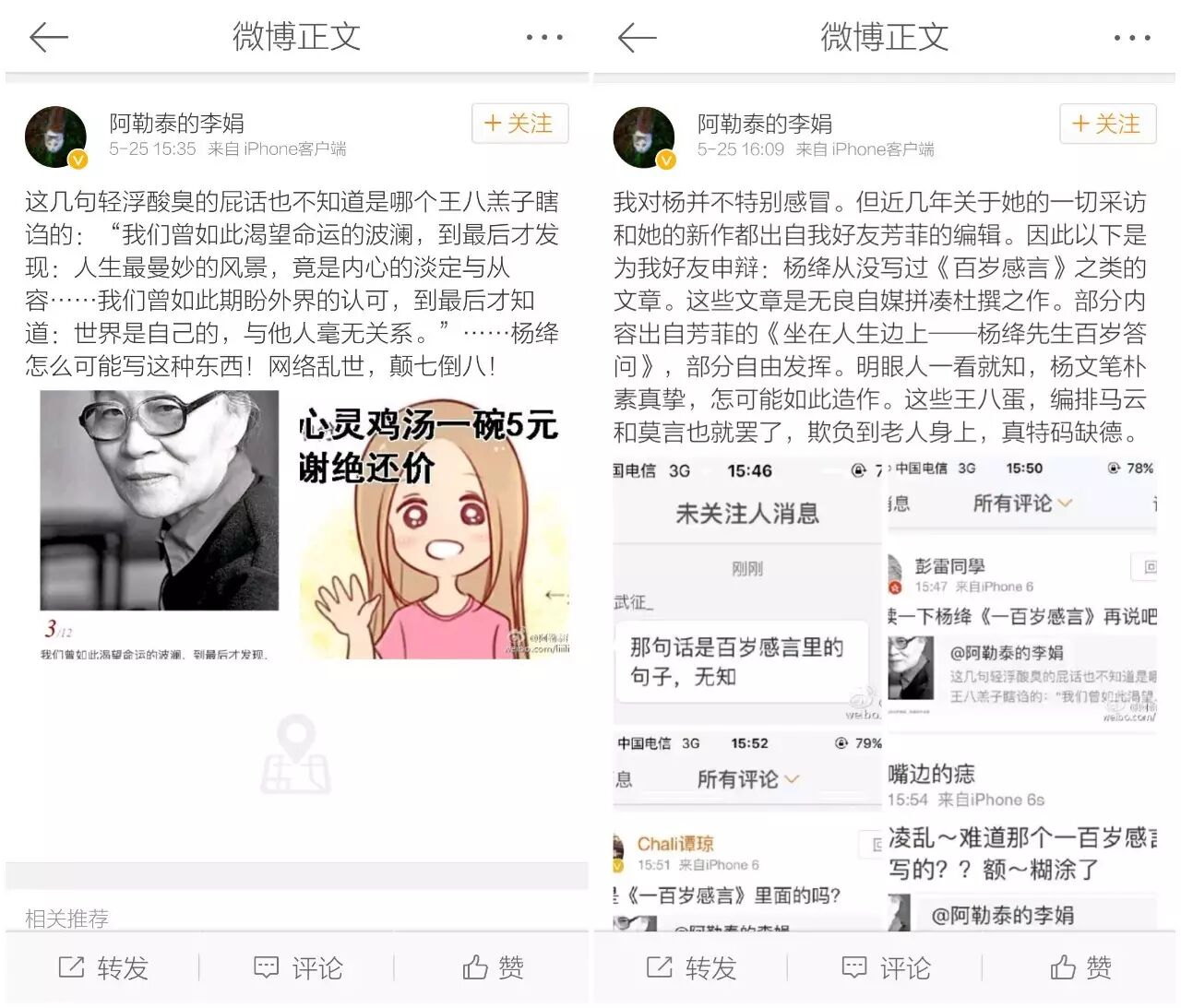 事情也发生了一些转折。在很多网友转发的所谓杨绛先生经典语录中,有些话并非杨绛先生本人所说。《阿勒泰的角落》的作者李娟也发微博鸣不平,对众人蜂拥而上转发感到生气。