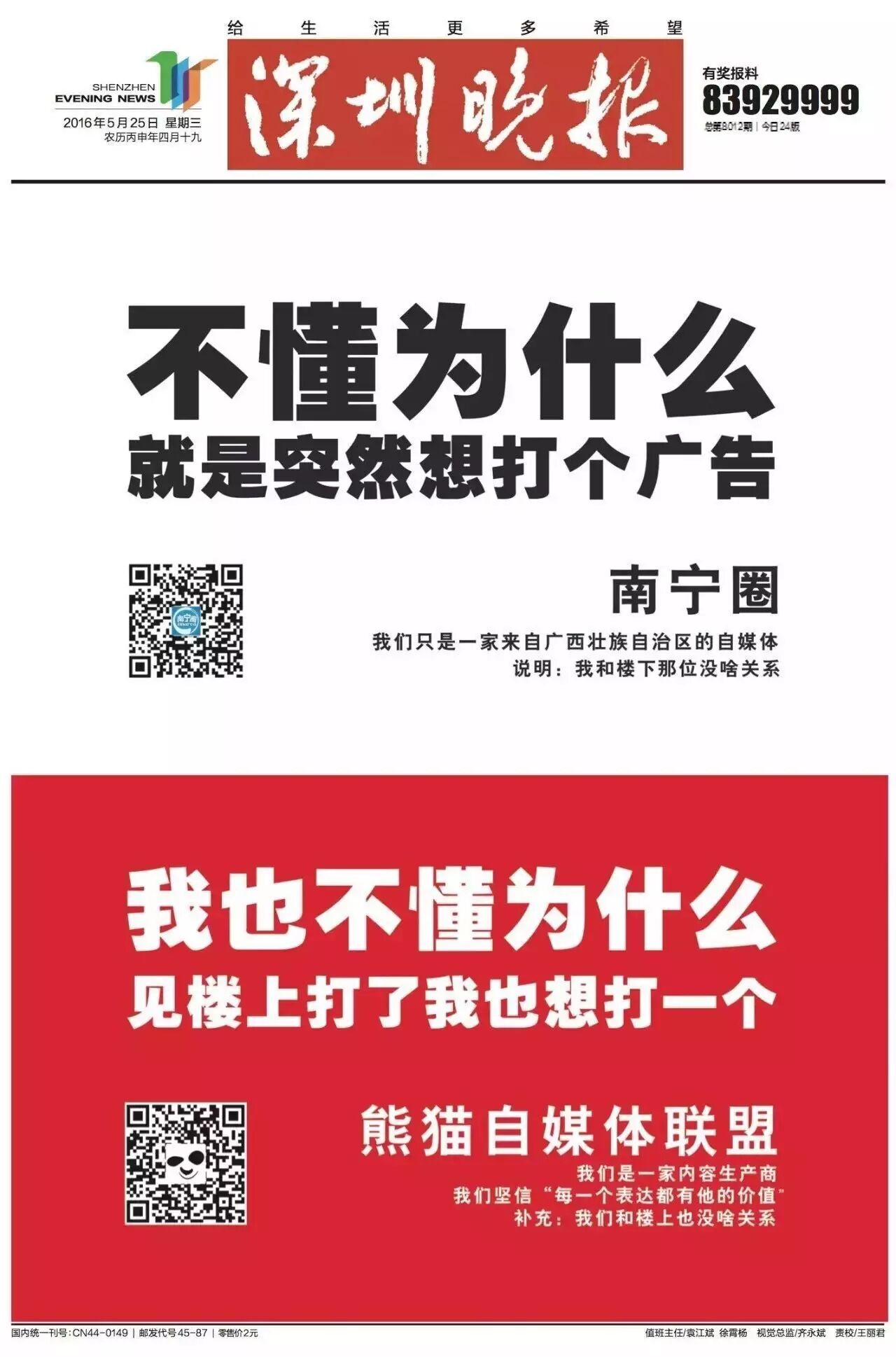 上周,“南宁圈”和“熊猫自媒体联盟”两家自媒体包下《深圳晚报》头版,打了两个无厘头的广告。一时间,“南宁圈”“熊猫自媒体联盟”和《深圳晚报》三方都火了一把。