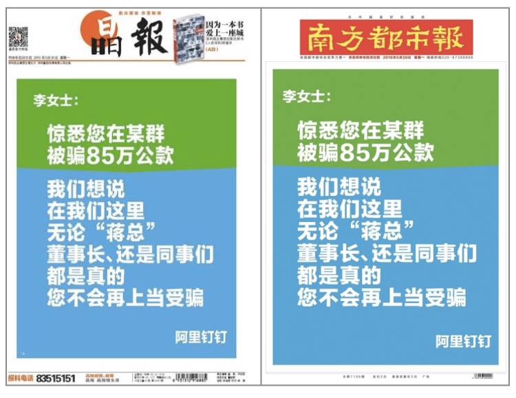 万万没想到,今天一早,《深圳晚报》故技重施,30日的头版广告再次被承包,这次的广告主是大土豪阿里巴巴旗下的企业应用——阿里钉钉。阿里钉钉承包整个头条,向微信发起了第二次“攻击”。