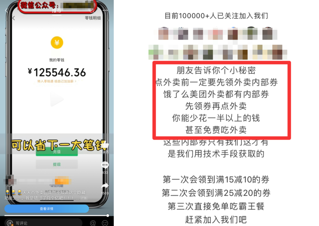 每条视频结尾都相同的“标准结局”:关注XX公众号,领取大额红包点外卖。