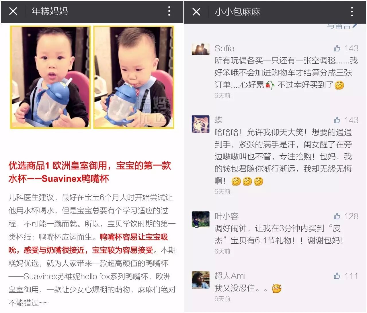 “小小包麻麻”中有一些母婴用品评测,受到很多妈妈的好评,时常会组织妈妈们团购,从评论来看,很多时候妈妈们都在“抢货”,信任度较高。“年糕妈妈”的介绍是“和百万用户分析走心好物的优选平台”,同样颇受好评。