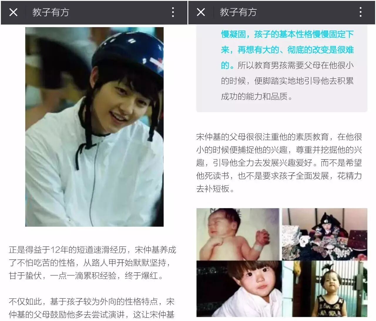这些账号多围绕儿童教育的日常展开,分享了许多实实在在的干货。其中,“亲子营”等账号中还有一些儿童教育资源共享;“益智学堂”更细分,专注于0-6岁的育儿知识;“教子有方”则建立了家长社群,除了分享教育攻略、学习方法,还从会明星角度切入育儿知识。比如最近一期文章《嫁不到宋仲基,那就培养这样一个国民老公吧!家有男孩必读》。