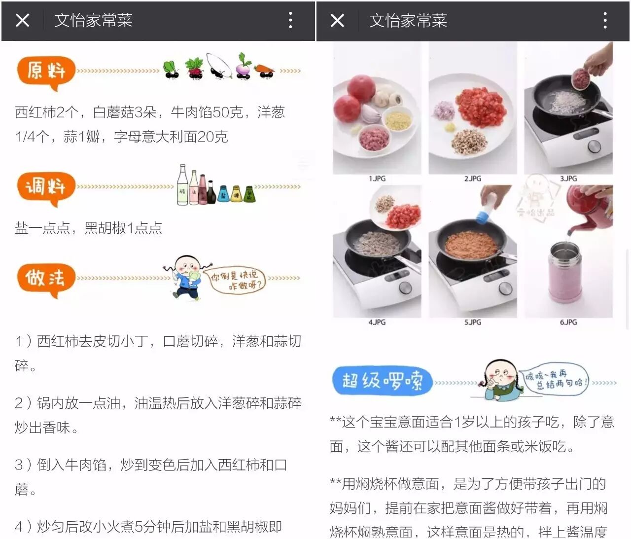 美食类账号优质者也非常之多,新榜在此前的“+新媒体美食开放日”活动中,也曾公布最近一期的美食账号top100强,值得参考。不过从孩子的角度,榜妹更推荐“文怡家常菜”这样偏家常的美食号,“文怡家常菜”的文章配备了漫画,也推出过一些适合宝宝吃的美食,比如《【宝宝意面】——带宝宝出门儿时,做它最方便!》,总体来说,适合一家几口在家操作。