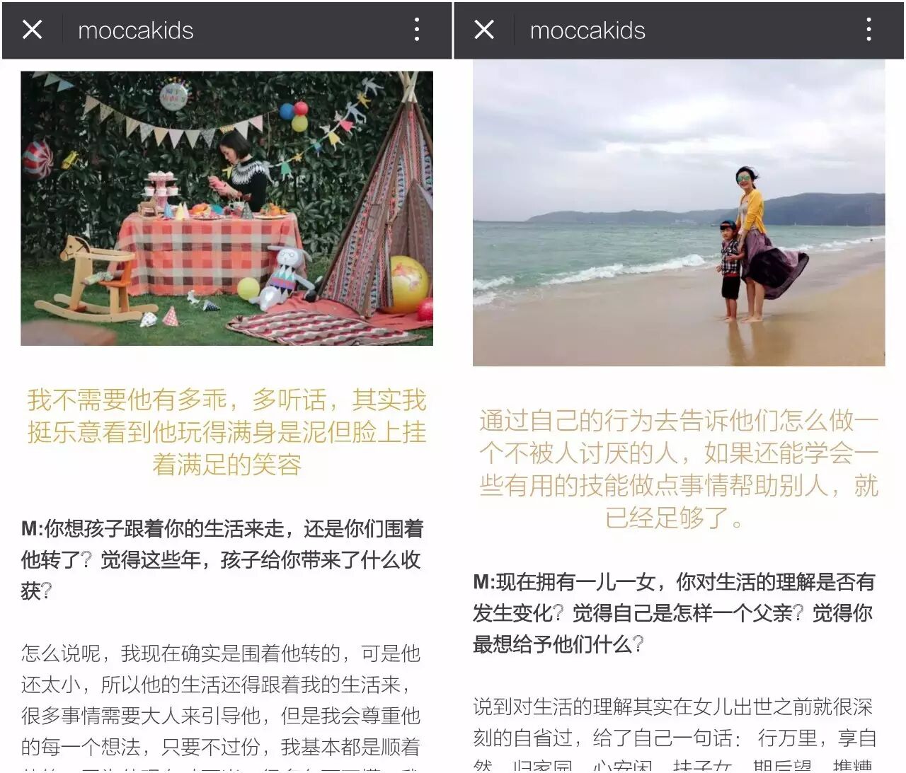 “Moccakids”会采访一些不同领域的爸爸妈妈,在文章中分享他们的生活方式、育儿观点、家庭规划等话题,角度平凡琐碎,但也非常有趣。比如最近一期《“妈妈”就是一个让家变得温暖的人-微访谈》,采访了一个叫易仙的80后全职妈妈。