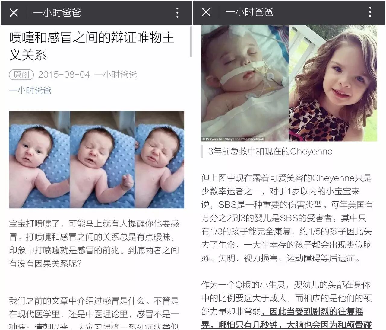 “一小时爸爸”成立于2014年,是致力于提高爸爸(包括妈妈)的技能和经验值的公众号。看一些文章的标题就很“爸爸”,比如《喷嚏和感冒之间的辩证唯物主义关系》。榜妹印象比较深的,还有一篇名为《你会把孩子晃出脑损伤么?》的文章,案例中,一名美国加州的爸爸竟然把哭泣中的女婴晃成了颅骨骨折。虽然所幸女婴后来健康地活了下来,不过爸爸们可走点心吧……