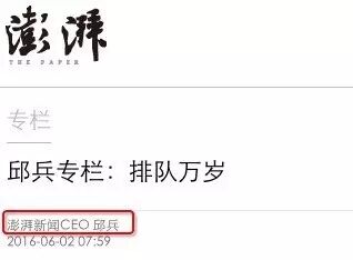 新榜讯 今天早晨,邱兵专栏再次出现在澎湃新闻客户端中,署名仍为“澎湃新闻CEO 邱兵”,标题是“排队万岁”。从这一署名方式可以确定,目前,邱兵仍在澎湃新闻。