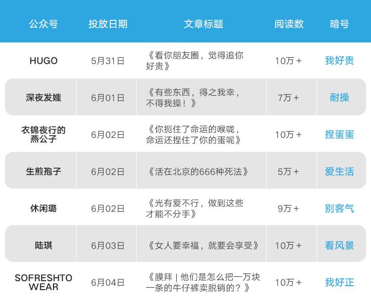 从5月31日起,小红书已经陆续开始了微信端的推广,为6.6周年庆做起了预热。本次,小红书通过新榜旗下提供广告匹配交易增值服务的媒介营销机构“博选优采”,一共选择了“HUGO”“深夜发媸”“衣锦夜行的燕公子”等7个微信大号进行相关软文的投放,在这7个微信大号中,其中有4篇软文的阅读数已突破10万+,总体覆盖近百万人次。