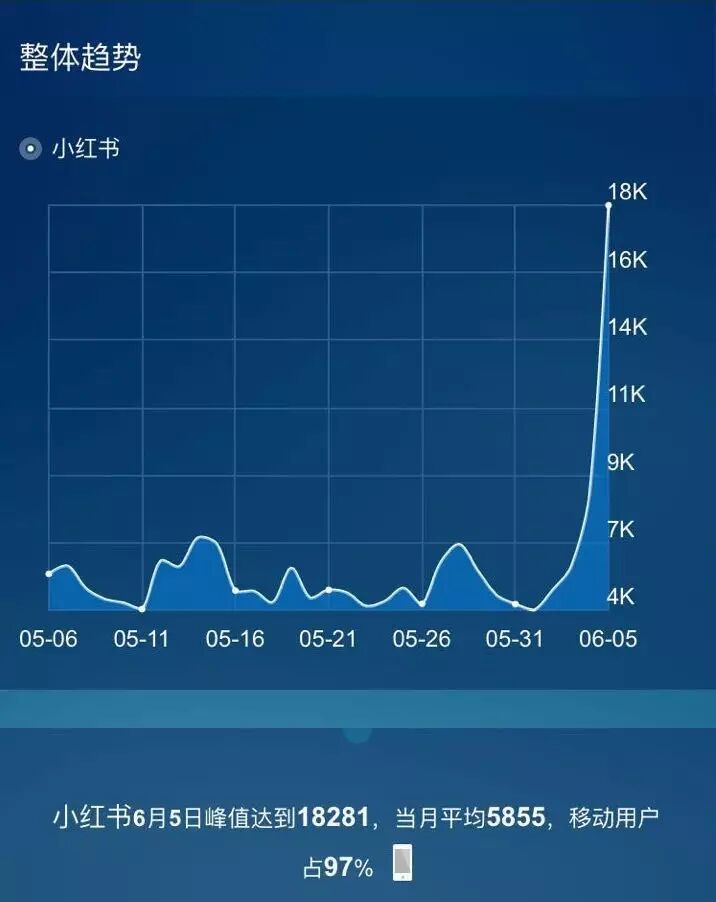 经过前期一系列的预热,以及今天一整天的直播,6.6周年庆掀起一波又一波高潮。从百度指数可以发现,“小红书”的搜索趋势在近7天内持续走高,6月5日的最新搜索指数已经较一周前高了数倍。
