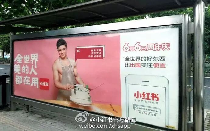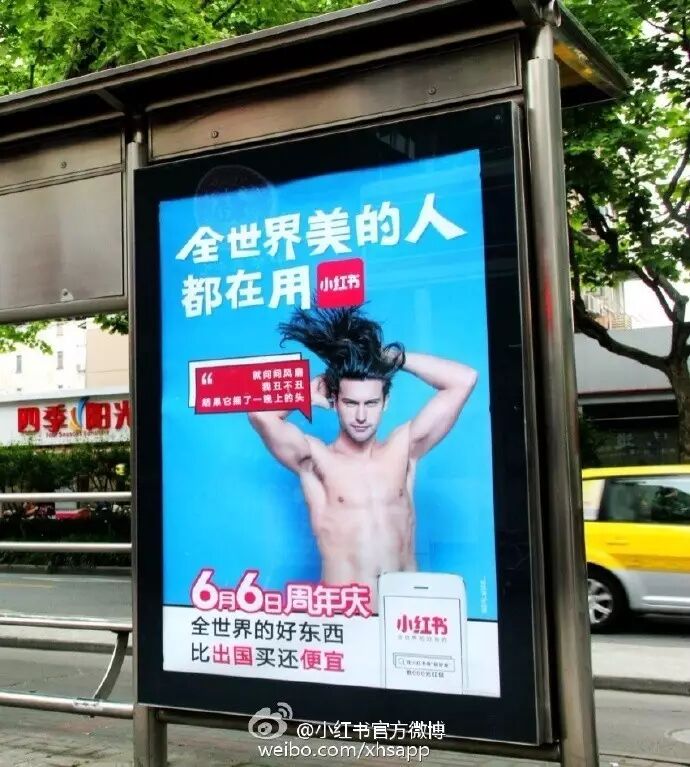 除了线上的直播之外,在线下,小红书在北上广深、南京、沈阳、武汉、无锡、大连、昆明、长沙等多个城市已经铺开了公交站牌广告,外国小鲜肉们同样是主打的广告主角。