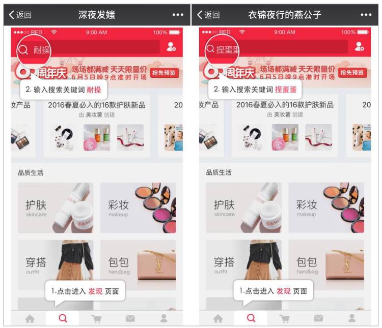 有趣的是,小红书为这7个大号设置了不同的“暗号”,每位微信主都拥有自己独有的搜索关键词,他们的粉丝可以用这7个不同的关键词在小红书App中进行搜索,从而获得6月6日当天的666元红包等优惠信息。而这些“暗号”,似乎都是为每个大号量身定做,如“深夜发媸”的暗号是“耐操”,“衣锦夜行的燕公子”的暗号则是“捏蛋蛋”,无不与每个微信号的气质和软文内容相匹配。