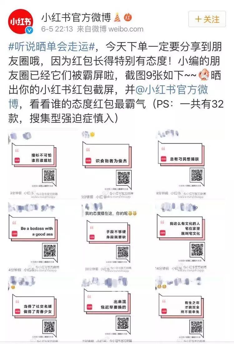 今年的6.6周年庆,小红书推出了一款限时66元的“有态度”T恤,而小红书也在官微上号召粉丝们截图晒单,可得到“有态度”的红包,一共有32款。