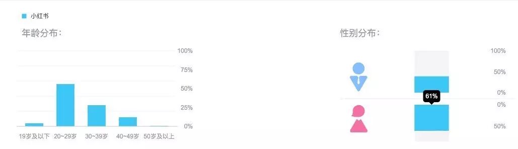 小红书这几年来坚持走男色营销路线,连代言人也是最热门的帅哥胡歌。很明显,小红书作为一款主打海外代购的App,其主要用户无疑是年轻女性。从百度指数的用户画像来看,搜索“小红书”的人群,女性占比达到61%,明显高于男性。