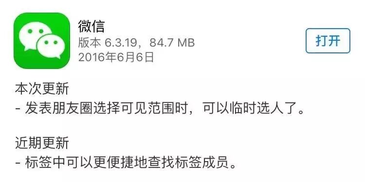 新榜讯 昨天,iOS版微信升级到了6.3.19版本,只有一个新功能,那就是:发表朋友圈选择可见范围时,可以临时选人了!