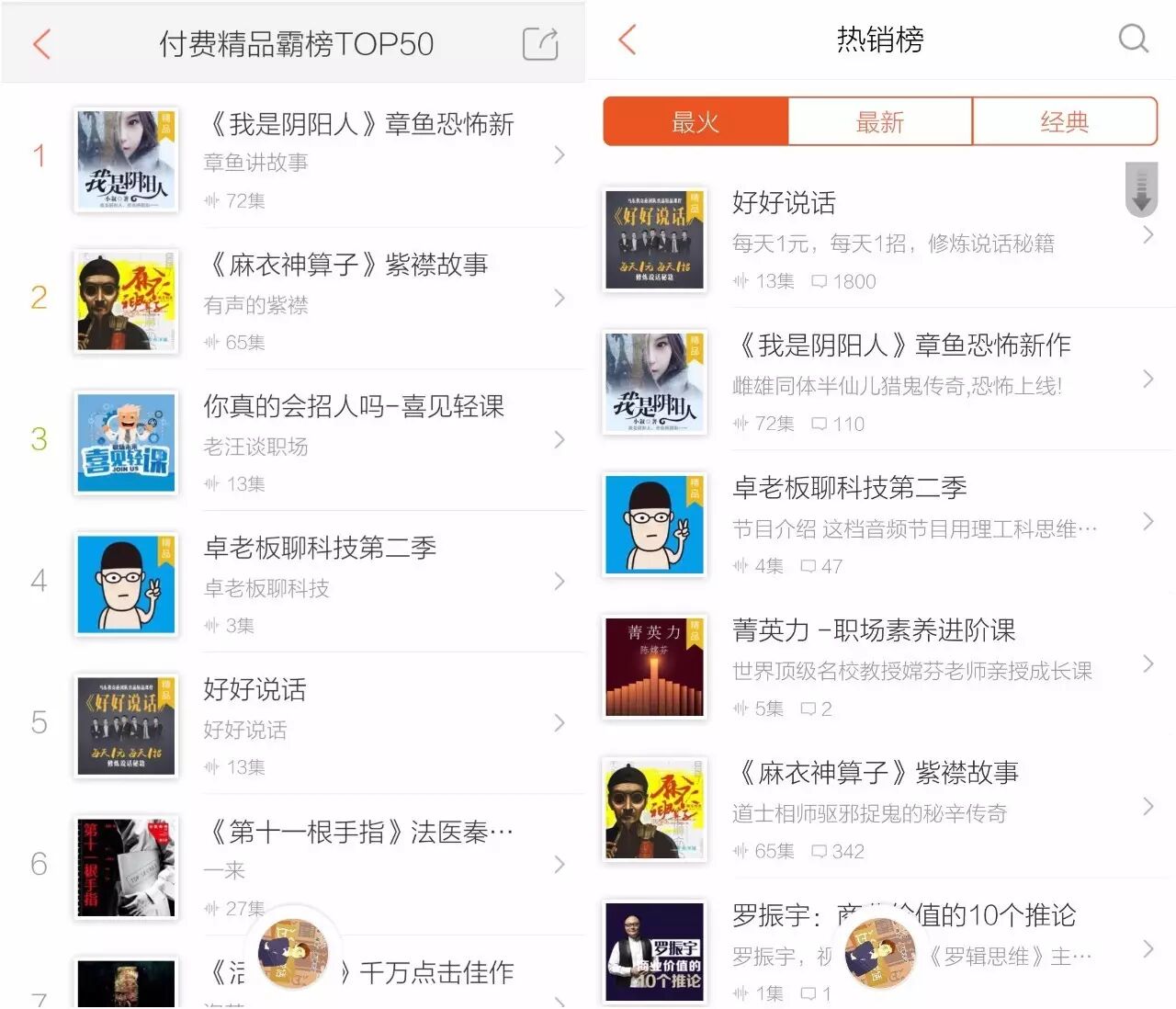 此外,喜马拉雅FM公关总监叶建平告诉新榜,《好好说话》是喜马拉雅与马东团队合作,为今年5月推出的付费精品区定制的第一个项目。吴晓波、樊登、葛剑雄、罗振宇、袁腾飞、秦朔、张德芬等数十位大咖的节目也将陆续上线。“我们希望各个领域拥有专业知识的人都能加入进来,让知识回归它应有的价值。”叶建平说。