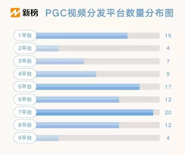 全网分发已经成为趋势,同时在5到8个平台分发的PGC视频占据多数。TOP100增量榜单中,有4档PGC视频在9个平台全部开通,它们是:暴走漫画、飞碟说、莱可传媒和女神TV。近七成PGC视频开通5个以上分发平台。