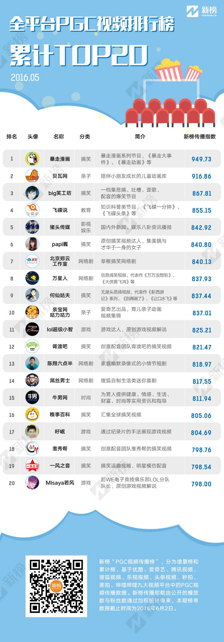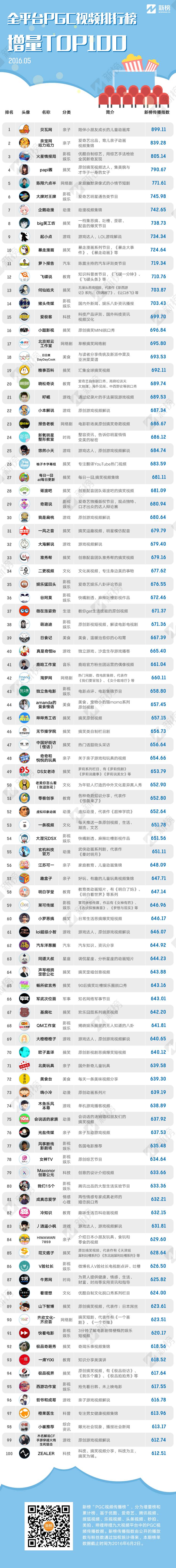 为保证5月底发出的视频有至少两天的传播期,本期榜单数据截止时间为2016年6月2日。