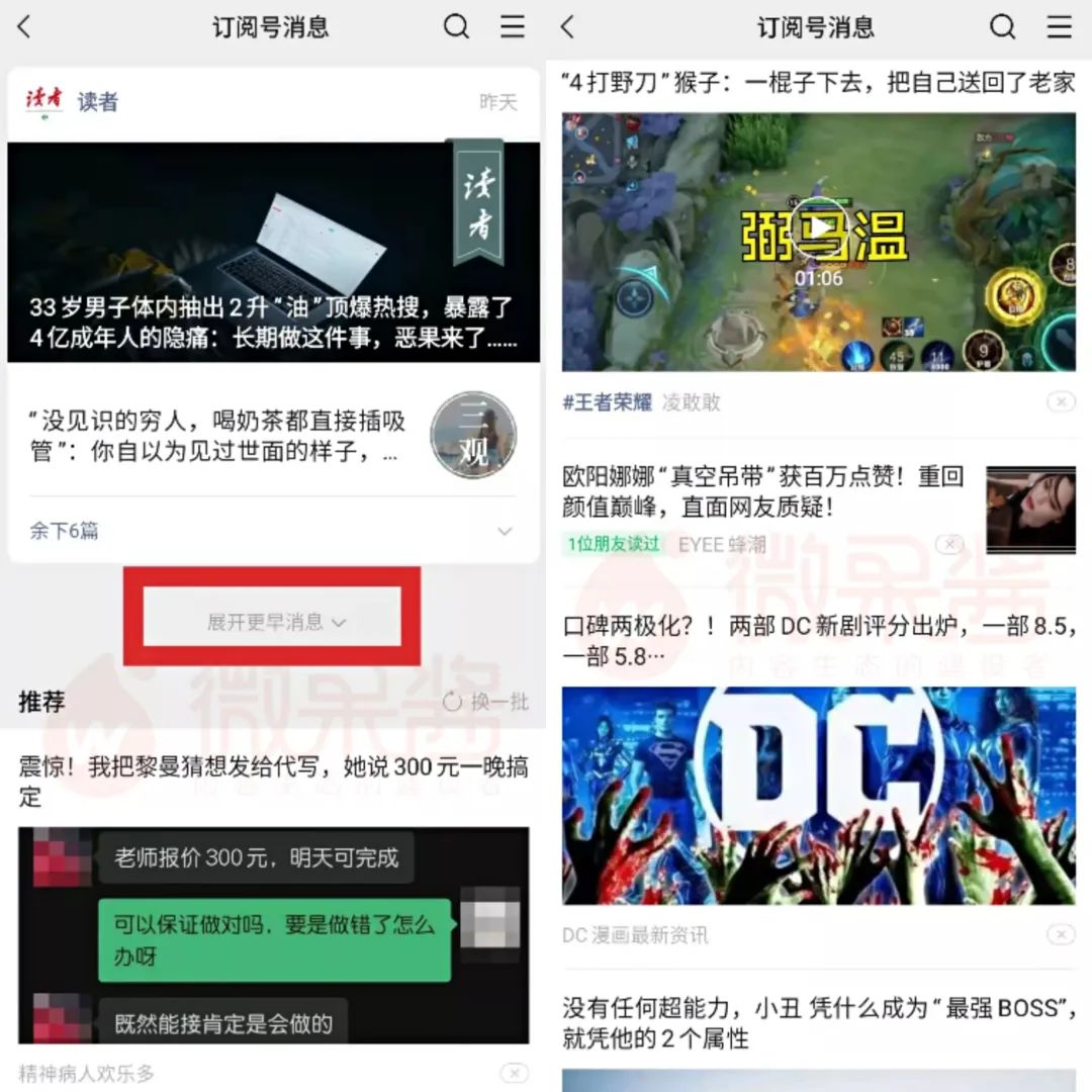 改版后,用户关注的订阅号消息被折叠,推荐内容比重增加。如果想看自己关注的公众号消息,需要点击“展开更早消息”并往下拉。