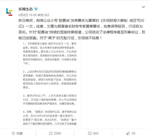 新榜综合报道 6月8日消息,针对某微信自媒体发表署名为夏草的《乐视财报大解剖:或巨亏20亿》一文,@乐视生态 声明称,该微信公众小号假冒夏草名义抹黑乐视,公司已经启动了法律程序甚至刑事诉讼,目前已经报案。