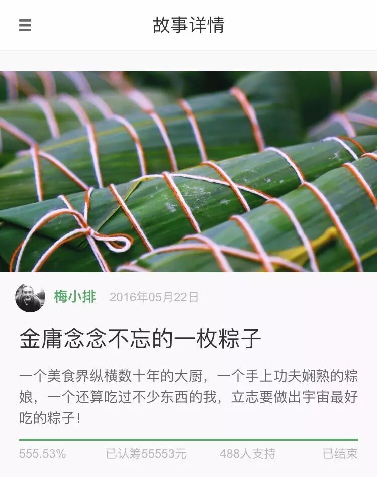 在开始众筹上,我们的粽子上线3天成交额大概5万多。原本我们和开始吧约订的众筹期是14天,最终3天的成交额就达到了预期的552%,怕产量跟不上,我们也只好提前10天结束众筹。而且开始众筹给我们带来了很多团体客户的订单,一些企业采购在开始众筹上预订粽子,尝试后觉得非常好,就跟我们批量订货。