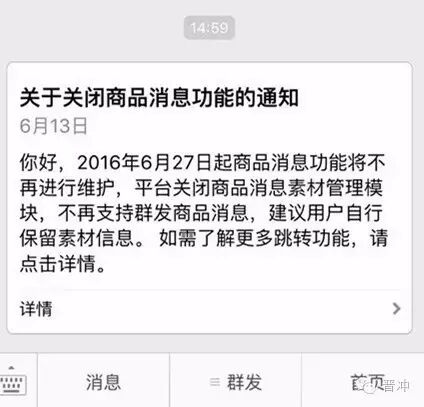 此功能支持直接发送外部超级链接,对于企业开展微商城营销具有巨大的好处,而此前微信官方客服对于关闭此项功能的解释为,新账号的商品消息列表于去年11月21日之后取消使用。