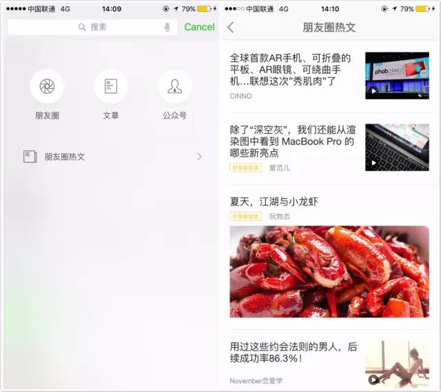 “朋友圈热文” 是微信在公众号内容传播渠道上进行的一次新尝试,用户在这里看见的内容将不只是来源于自己的朋友圈,而是整个微信朋友圈数据库中精选的优质文章。此前,微信也曾在这个位置发布了“一周朋友圈精选”功能。