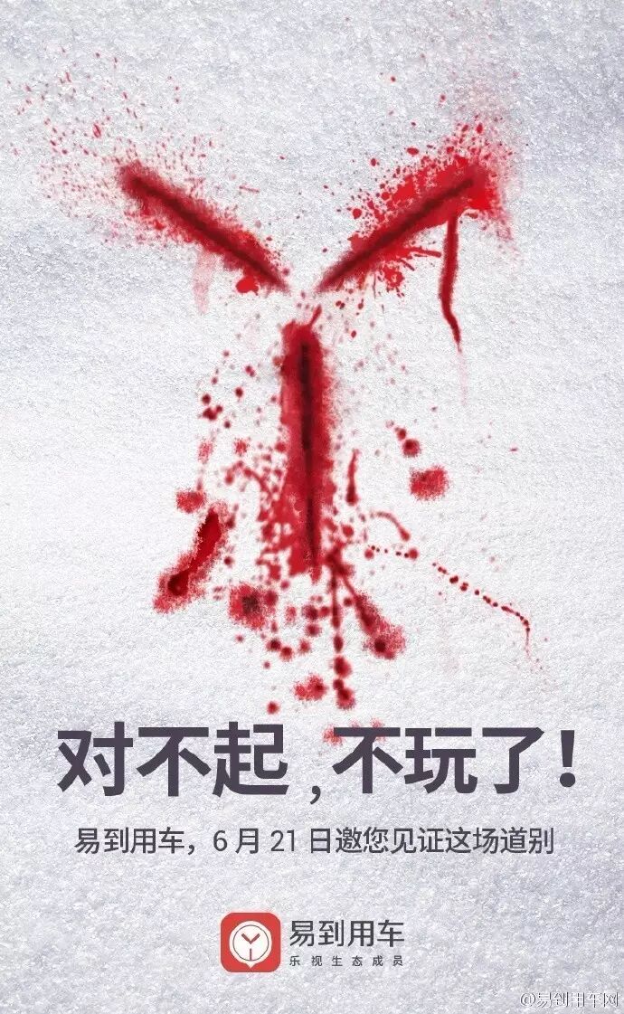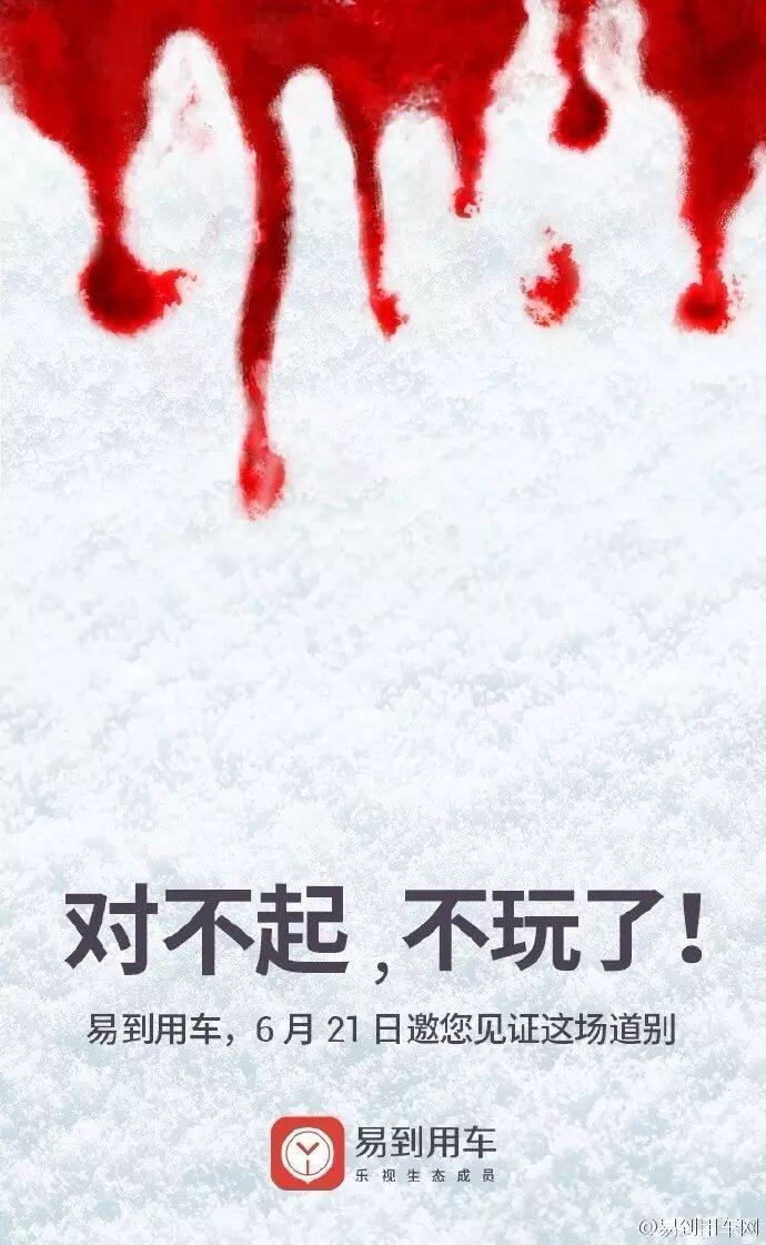 昨天下午,易到用车网官方微博突然发布了一张惊悚的血色海报,并表示“对不起,不玩了!”,并将事件的答案引向了6月21日的发布会。一时间引起热议,多数人表示摸不着头脑。