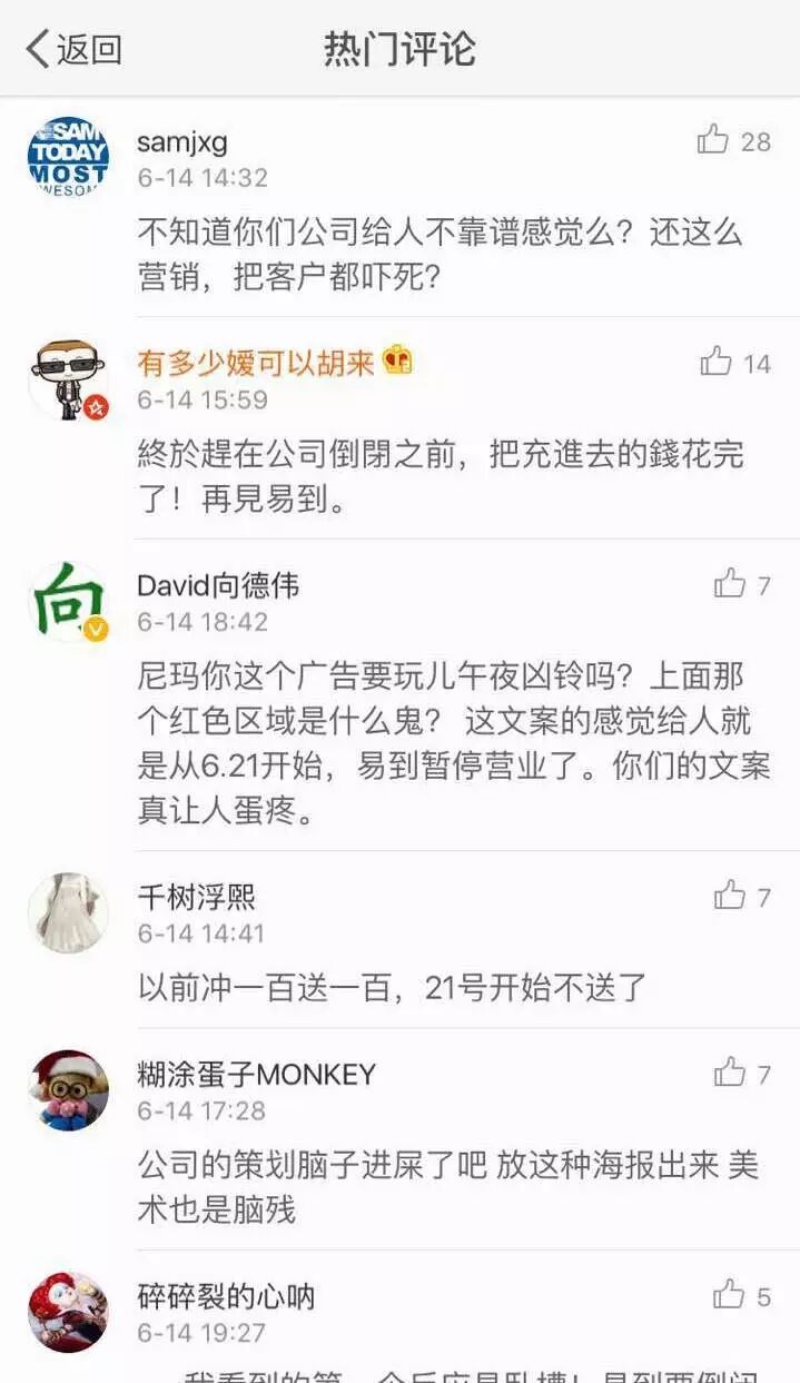 易到用车究竟想干嘛?只能等到6月21日揭晓谜底了,但是对于这次营销事件,粉丝们似乎并不买账,从微博下的热门评论来看,粉丝们对于“不玩了”这种听上去玩世不恭,不把用户当一回事的文案,颇为反感。